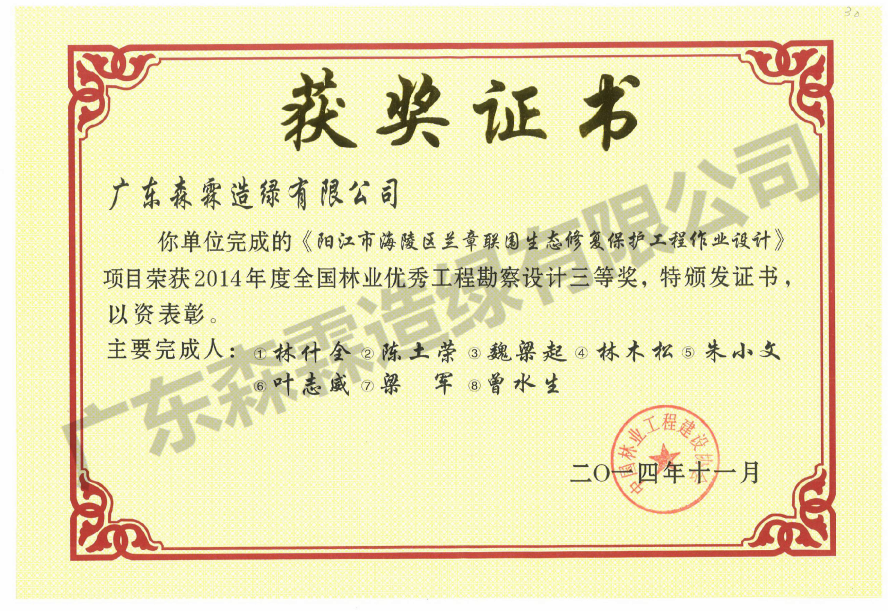 2014年度天下林业优异工程勘探设计三等奖证书
